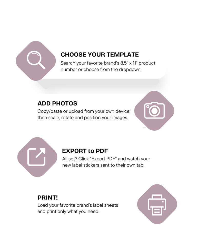 MyFastSnaps lets you print on 8.5" x 11" label sheets you already own — just choose the template that matches your label sheet's product number and send to your printer.